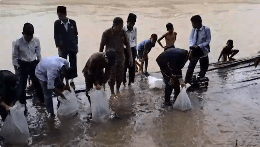 Pelajar setingkat SMP dan SMA, melakukan penebaran 2000 bibit ikan baung dan semah ke Lubuk Larangan Desa Pulau Pauh, yang berada di hulu Sungai Pengabuan.